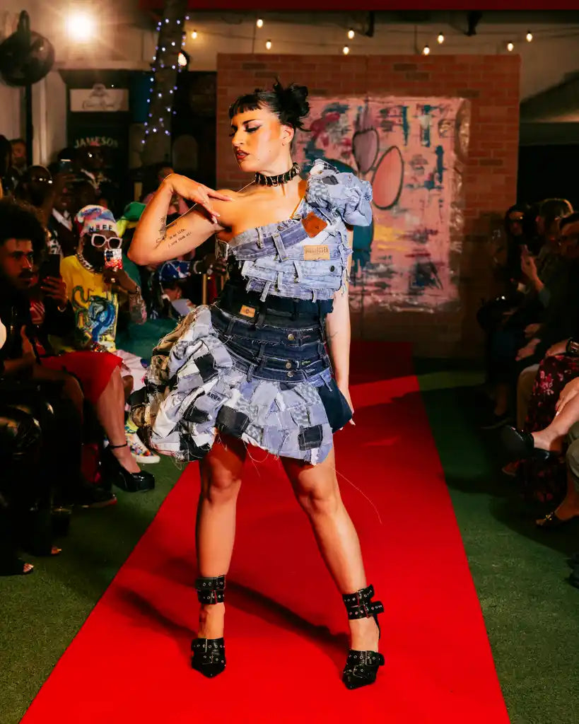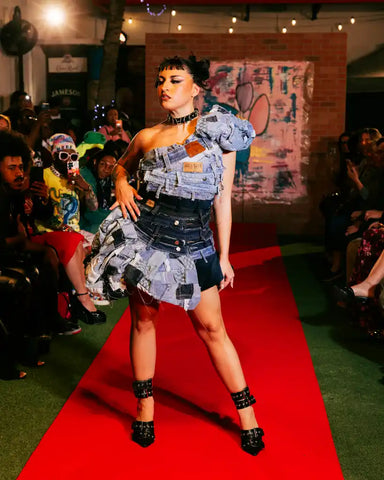 denim dress made from deconstruction of dozens of pants, cut into small squares and sewn together to make a textile. that textile was used for the skirt and shoulder constructions. the remaining denim was used for the base dress, then leftover waistbands were sewn onto upper body of dress.